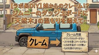 娘からの「不便すぎる!」という一言でDIY決行!ジムニーJB64のダッシュボードに1,280円のアカシア板でテーブルを自作しました。直感で選んだ天然木の温もりと、小4娘の評価は?ネットのアイデアを自分流にアレンジし、読者の皆さんの意見も伺いたい「共感型」カスタム記録です。